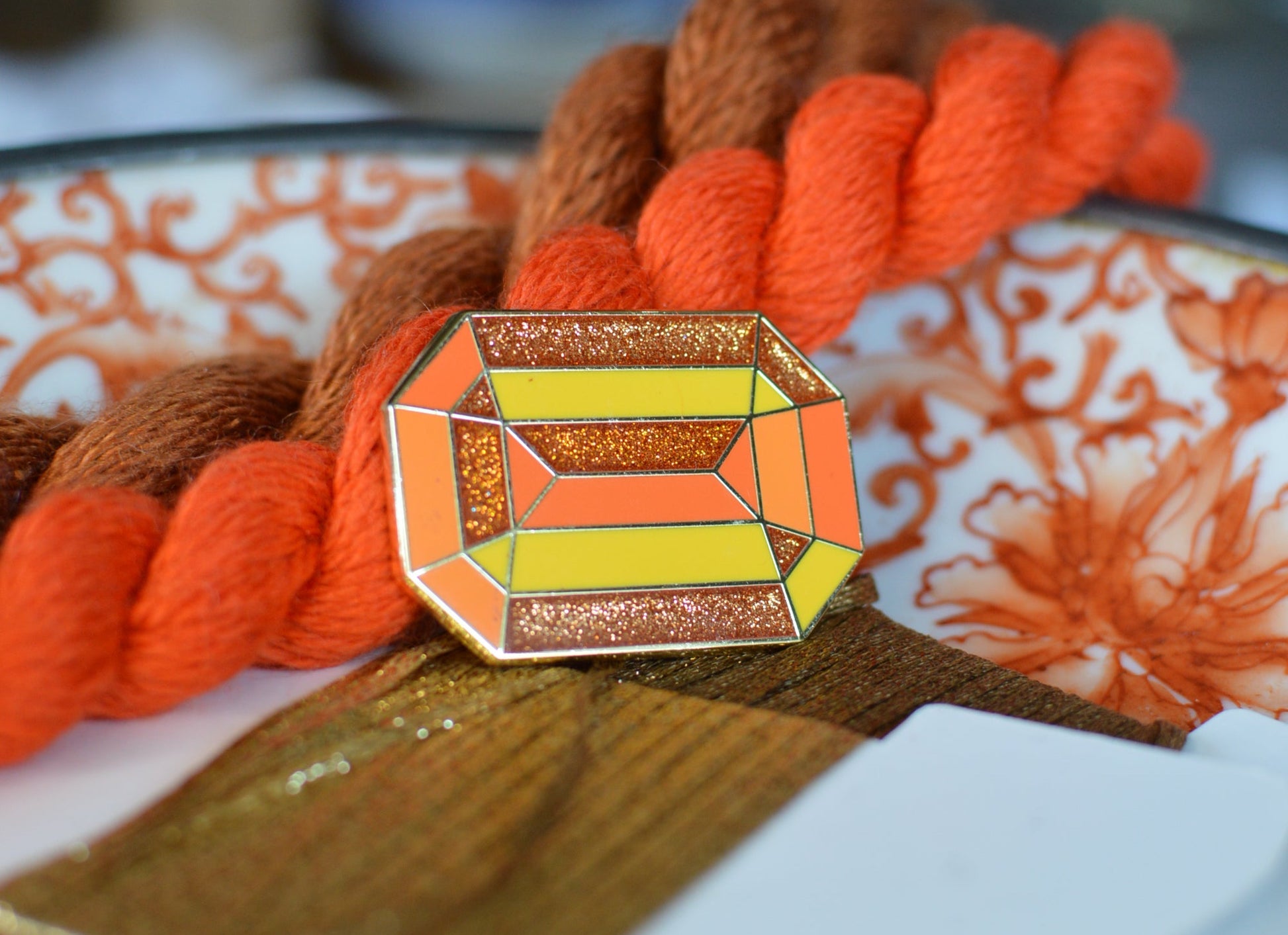 Various colors or oranges, yellow and gold glitter hard enamel with gold metal accents.