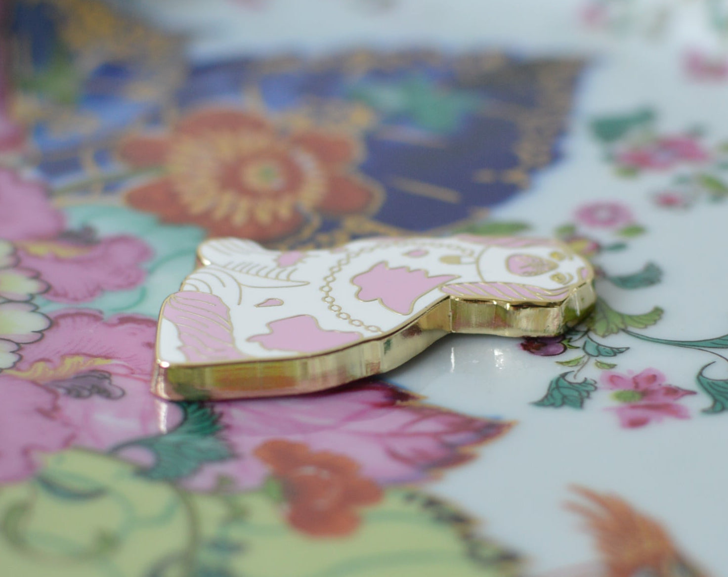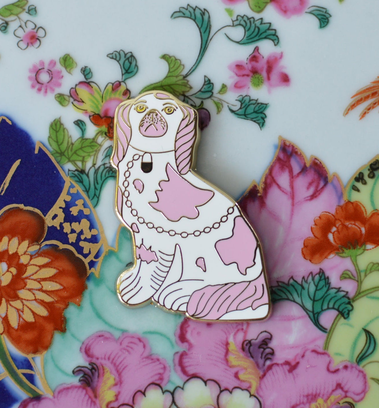 Pink and gold Staffordshire dog with pink and with hard enamel, and gold chain detail.